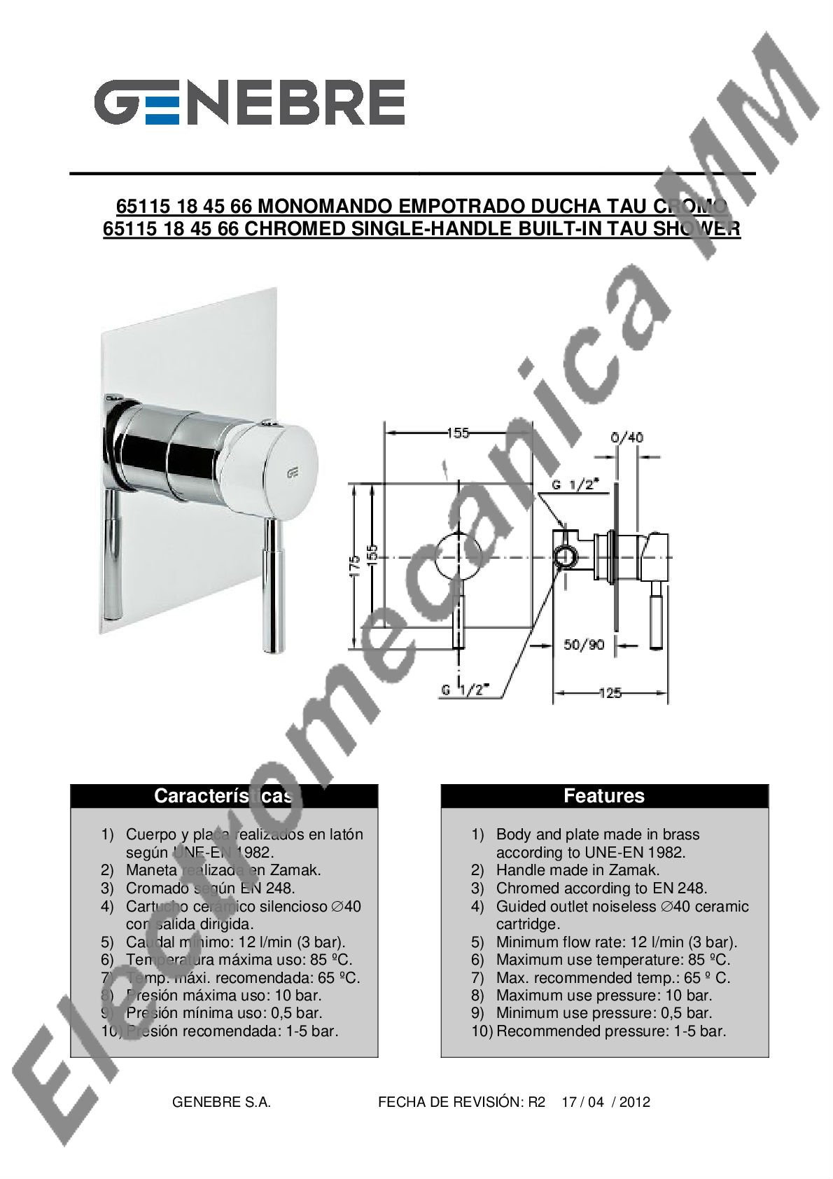 Monocomando Empotrado Ducha – Genebre – Artículo 65115 18 45 66