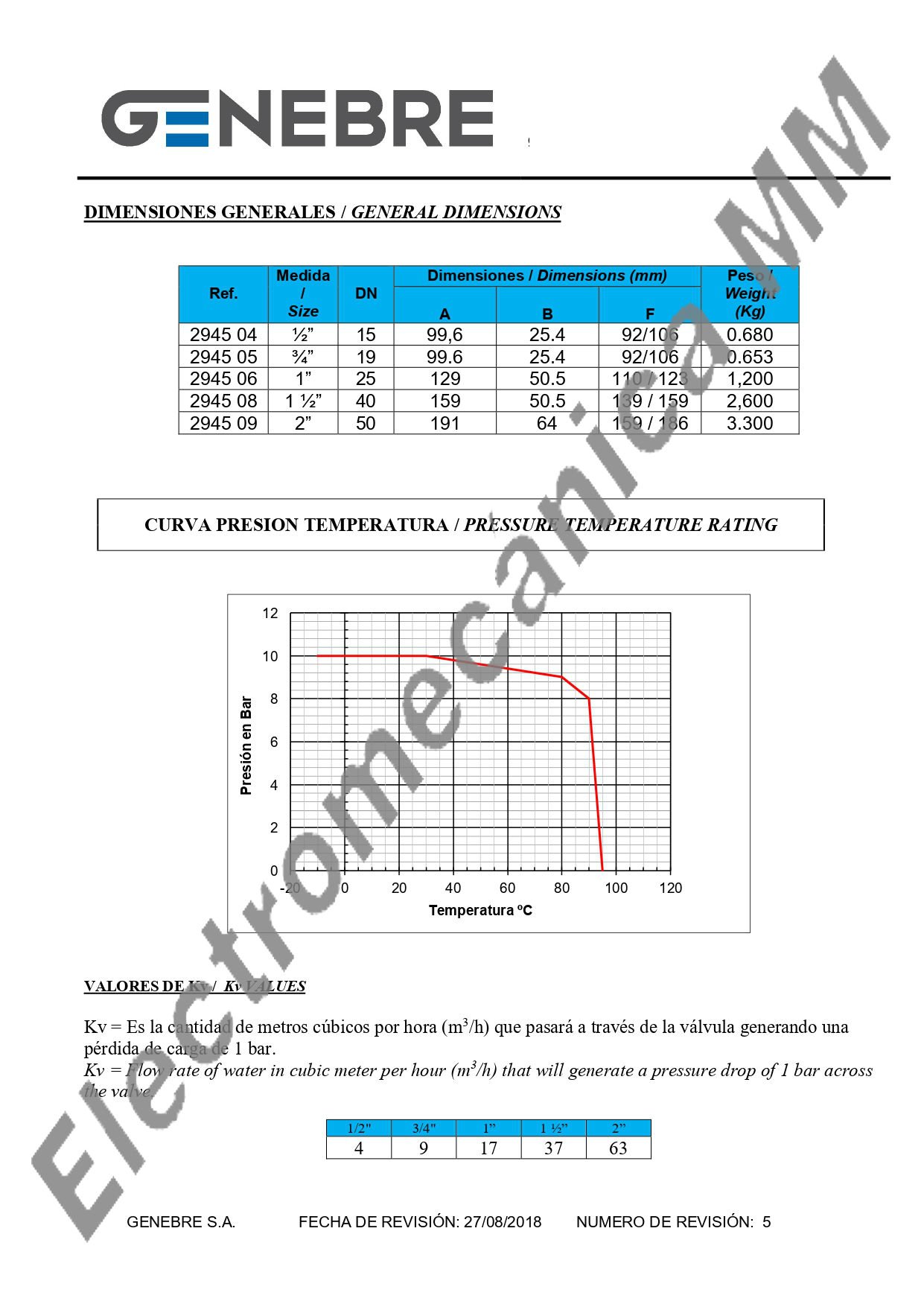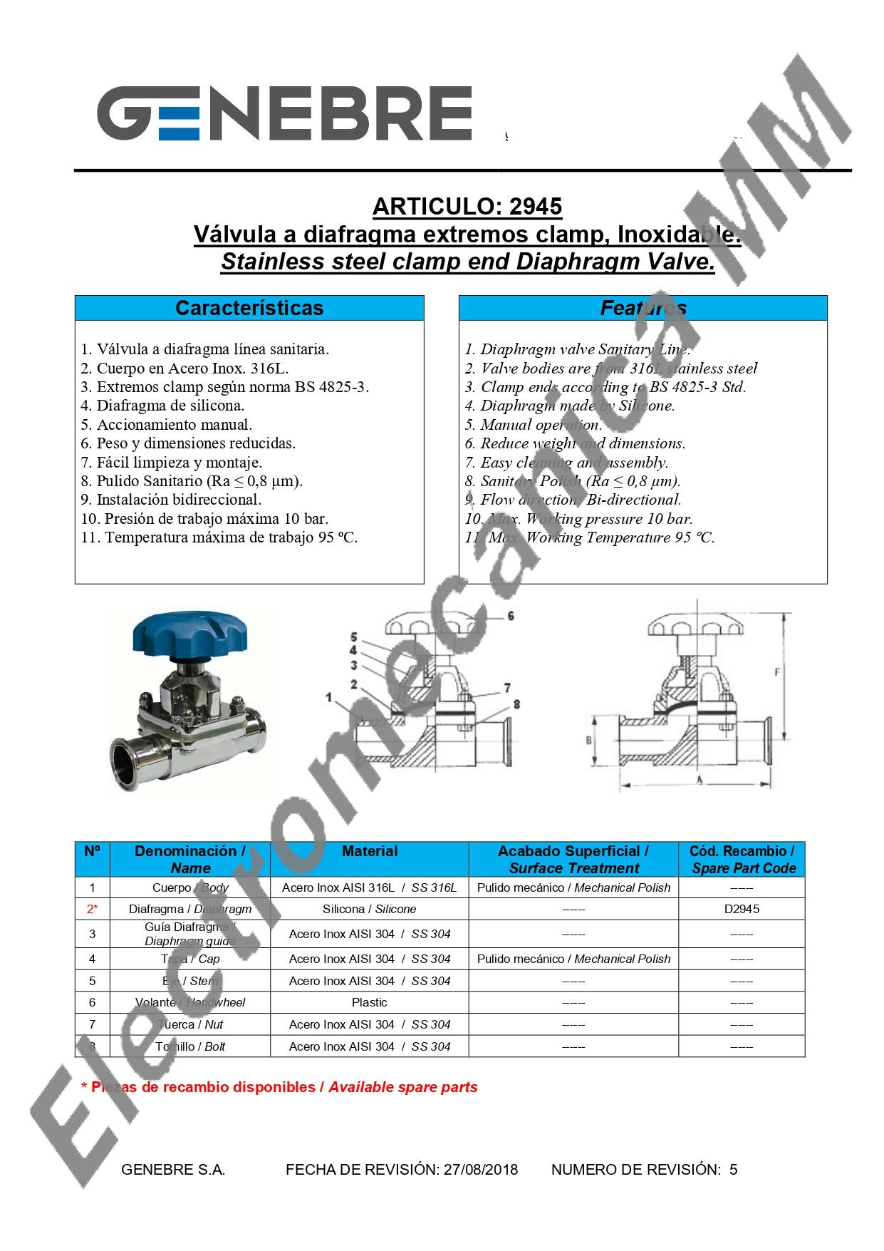 Válvula a Diafragma Extremos Clamp en Pulgadas 1 1/2” – Genebre – Artículo 2945. Cuerpo acero inoxidable AISI 316L. Diafragma silicona (otro material consultar). Extremos: clamp en pulgadas. Pulido sanitario. Presión máx. de trabajo: 10 bar. Temp. máx.: 95ºC. Accionamiento manual.